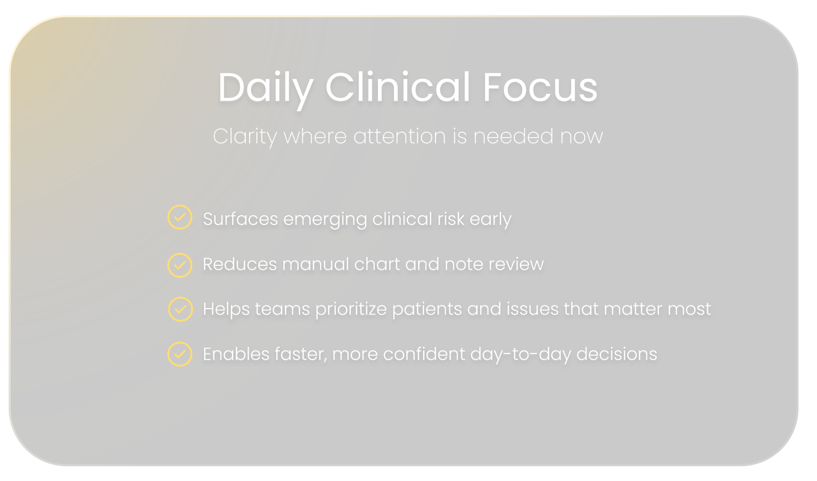 It continuously analyzes clinical documentation to surface emerging risk patterns early —